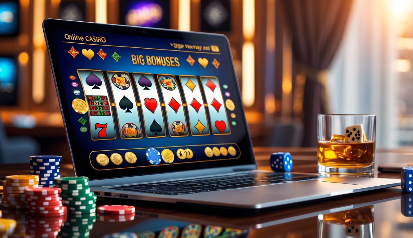 Seorang laptop di atas meja kayu dengan layar menampilkan permainan kasino online, dikelilingi oleh chip kasino, dadu, dan gelas minuman.